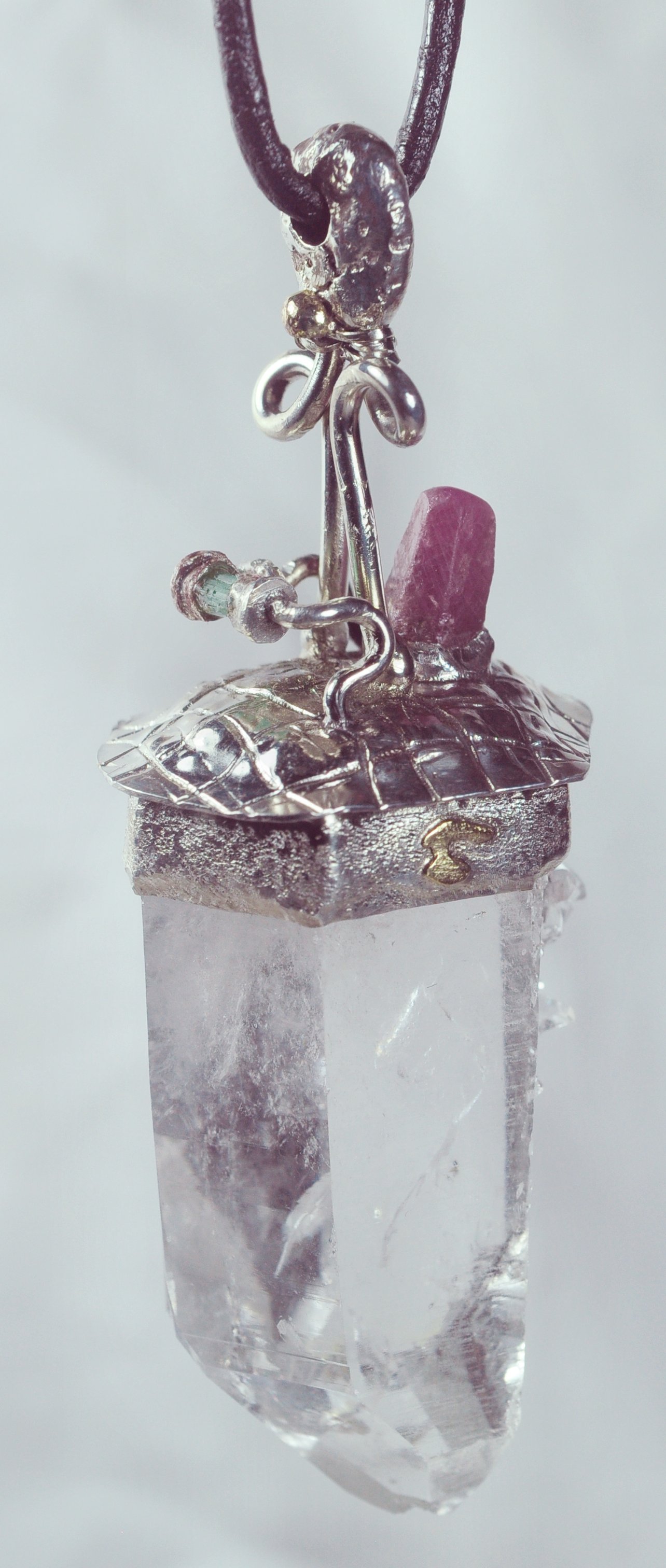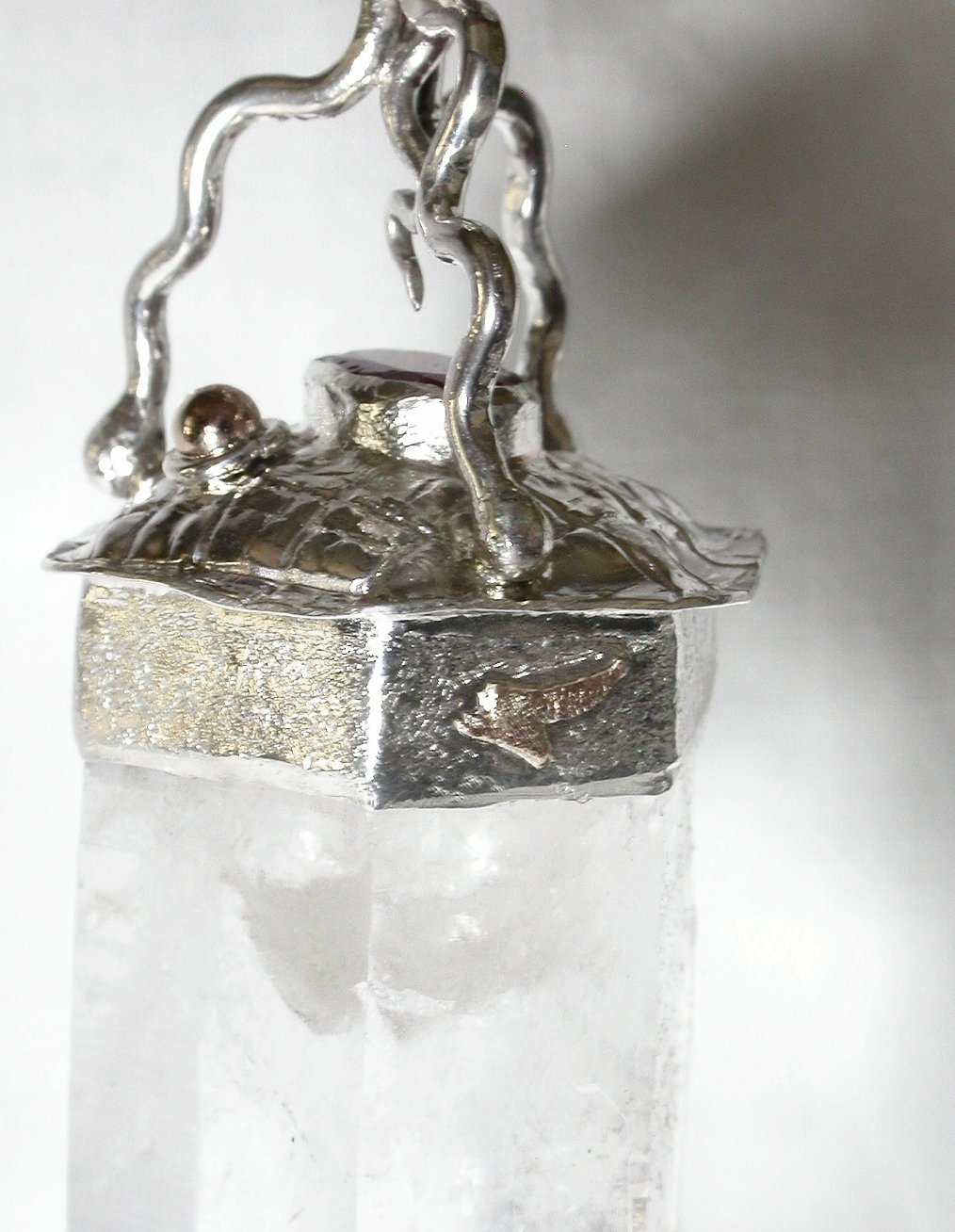 View 2 View 3 View 4 View 5 View 6 View 7 View 8 View 9 View 10 View 11 View 12 Quartz crystal talisman pendulum pendant energy tool fine ruby and emerald multi- recorder Arkansas quartz crystal Amazing Shamanic energy power tool powerful healing meditation tool beautiful to behold soothing to wear and use hand fabricate by Mystic Merchant Billy Mason sterling silver View 8 shows 14 gold accent eagle & sphere adjustable leather necklace included 83 x 29 x 21 mm item # qrtzcryrubemertalis-1 $3939.99 |